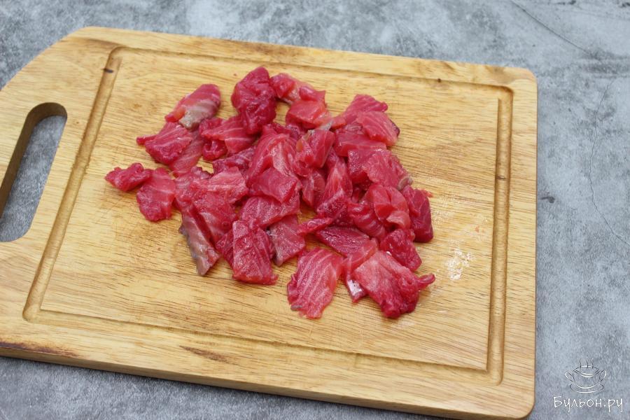 2. Слабосоленый лосось нарежьте небольшими кусочками. У меня рыбка домашняя, засоленная со свеклой, поэтому имеет такой красноватый оттенок. Однако вы можете использовать уже готовую рыбку.