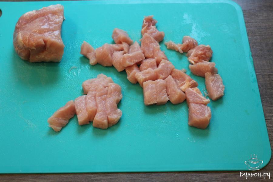 1. Возьмите постную свинину, нарежьте ее на небольшие кусочки. Выложите их на сковороду, добавьте растительное масло и обжарьте слегка, чтобы мясо осталось сочным. В конце мясо подсолите.