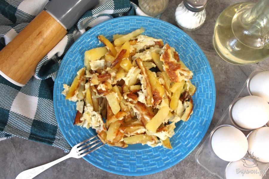 Даже из самых простых ингредиентов, можно приготовить очень вкусный и простой ужин. Сегодня, вашему вниманию, я представляю очень простой гарнир - это жареная картошка с яйцом. Однако, это блюдо можно рассматривать, как самостоятельное, а можно дополнить мясом или рыбой. Также данный картофель можно дополнить грибами, кусочками ветчины, кубиками помидор и так далее. Картофель для этого рецепта лучше брать не рассыпчатый, чтобы при жарке картофель не разварился и не превратился в кашицу.