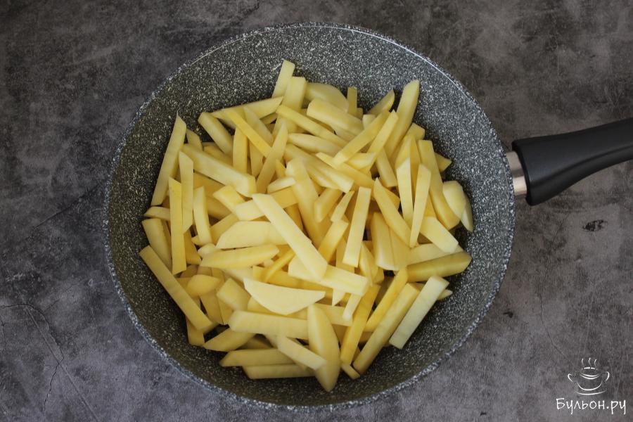 3. В сковороду, с разогретым маслом, выложите обсушенный картофель и обжарьте его в течение 20 минут, изредка перемешивая картофель во время жарки. Посолите, поперчите и добавьте свои любимые специи. Перемешайте и жарьте картофель еще 5 минут.
