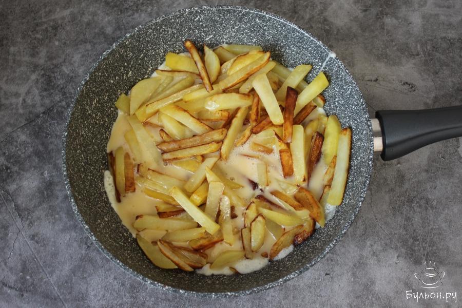 5. Перелейте яичную массу в сковороду с картофелем, аккуратно перемешайте, закройте сковороду крышкой, убавьте огонь и готовьте картофель еще 10 минут.