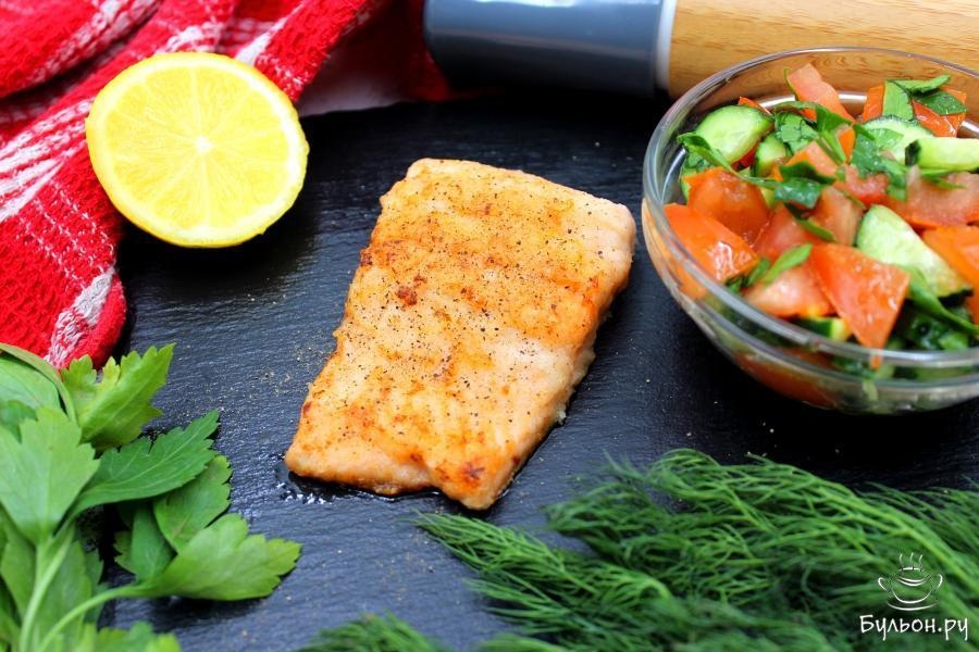 7. Подайте форель, жаренную на пергаменте, на красивой доске вместе с овощным салатом. Сверху можно немного полить маслом, которое осталось после жарки на пергаментном листе.