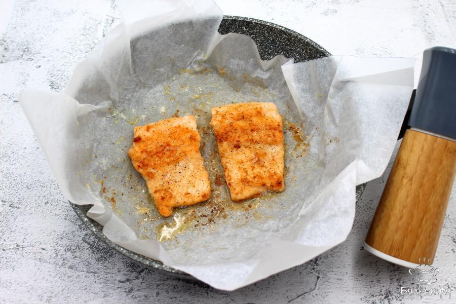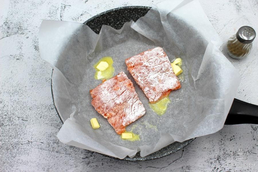 5. Выложите на пергамент рыбу, рядом положите кусочки сливочного масла. Жарьте рыбу с каждой стороны по 4-5 минут на среднем огне. Если рыба прилипла к пергаменту, снимите сковороду с огня, накройте крышкой. Внутри образуется пар, который размягчит пергамент и позволит легко снять рыбу.