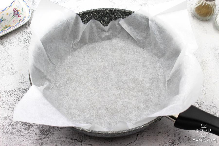 4. Застелите сковороду пекарской бумагой так, чтобы боковые части сковороды были покрыты бумагой. Нагрейте сковороду на среднем огне.