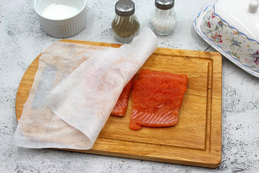2. Филейные кусочки рыбы промойте под водой, обсушите бумажными полотенцами и, если есть косточки, удалите их пищевым пинцетом.