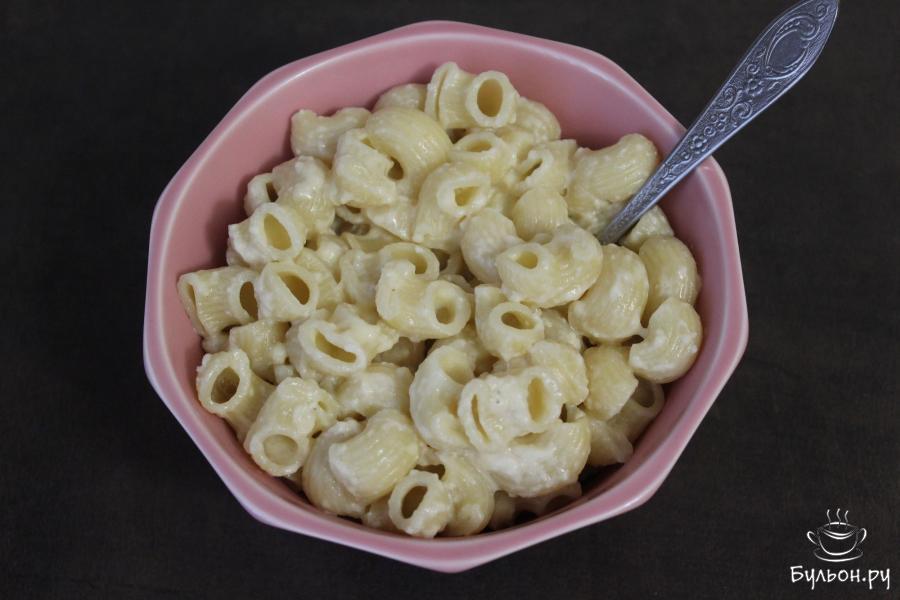 6. Как только сыр расплавиться, снимите сковороду с огня, и горячие макароны разложите по тарелкам. Подайте на стол.