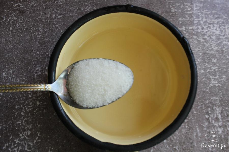 4. В холодную воду добавить часть сахара. Поставить посуду на огонь и довести сироп до кипения. В процессе приготовления, сироп пробовать и, если нужно, добавлять оставшийся сахар.