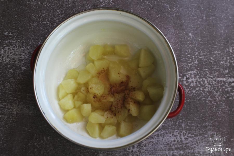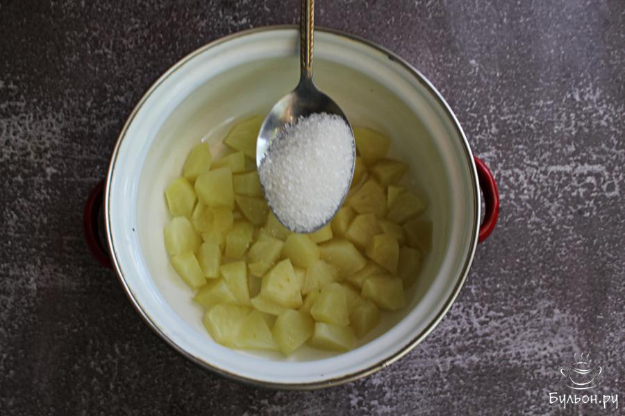 1. Яблоки почистить, мелко нарезать, добавить сахар и проварить до мягкости. Сразу, вначале приготовления, начать помешивать яблоки, чтобы они дали сок, тогда не надо будет добавлять воду.