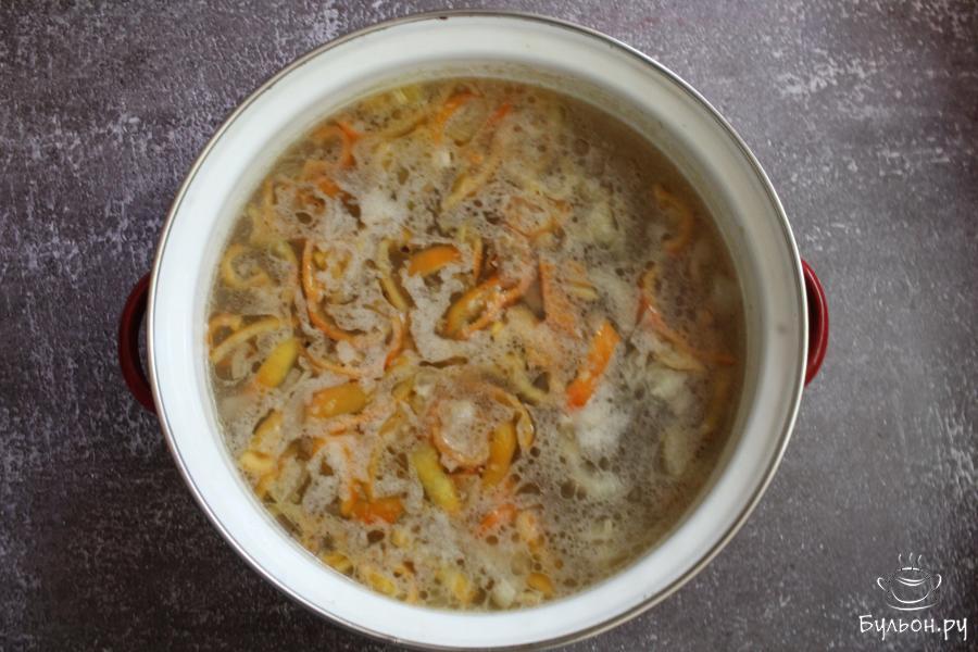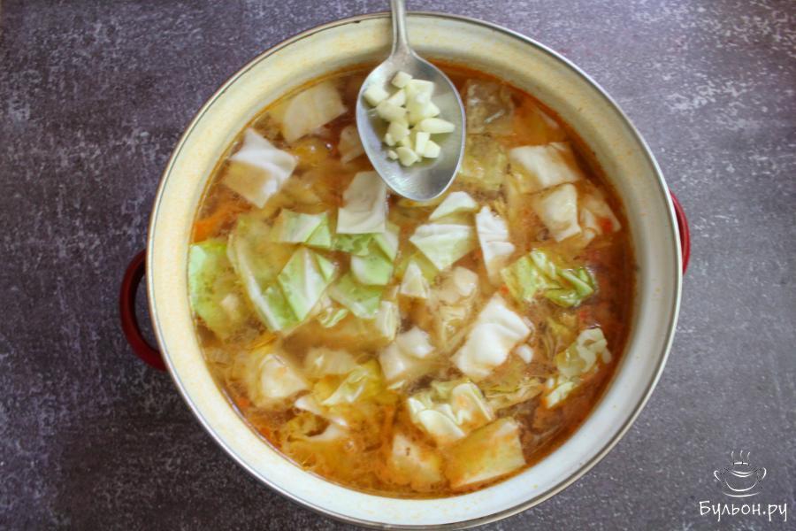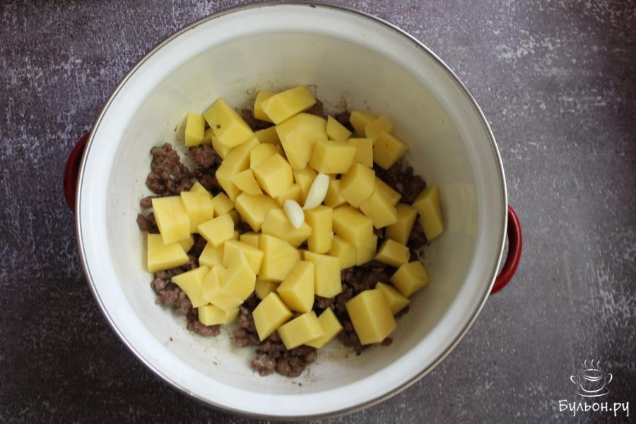 2. Картофель нарезать кубиками и добавить к фаршу. Добавить 2 целых зубчика чеснока. Влить воду и варить суп 10 минут, затем чеснок убрать.
