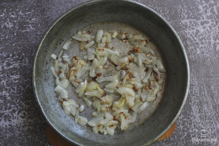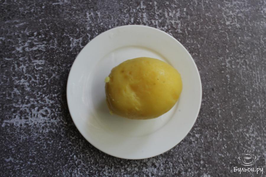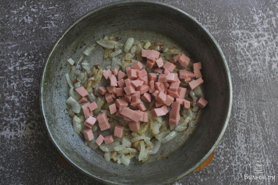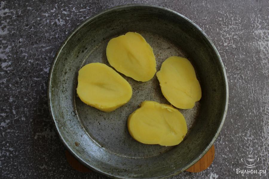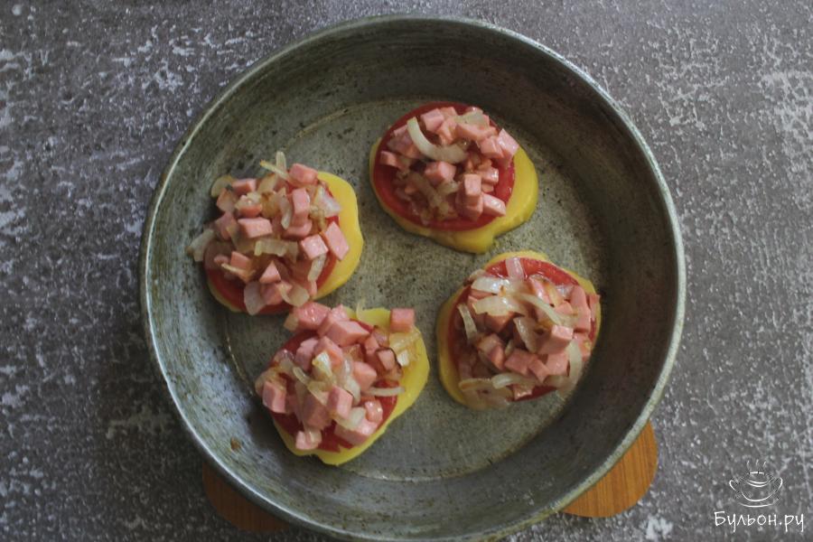 4. Картофелину нарезать не очень тонкими кружочками, немного посолить. Выложить кружочки на сковороду, на которой жарили лук с колбасой.