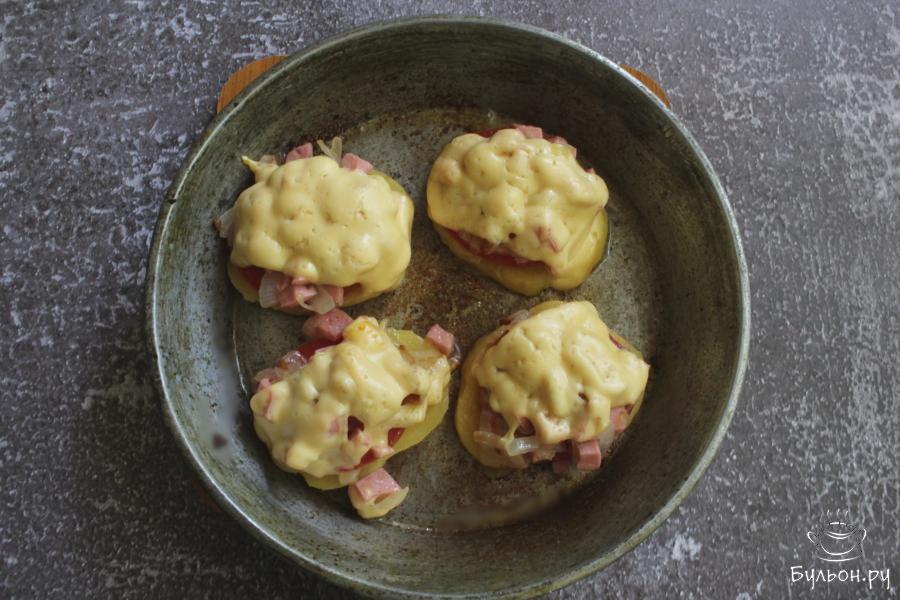 8. Накрыть сковороду крышкой, поставить ее на небольшой огонь и прогреть закуску несколько минут, чтобы сыр расплавился.