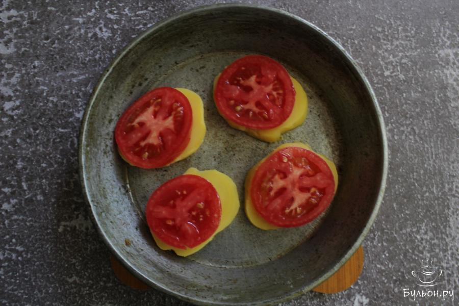 5. Крупный помидор нарезать не очень тонкими кружочками и разложить по кружочку на картофель. Помидор тоже можно посолить.