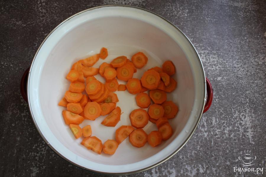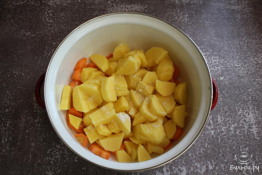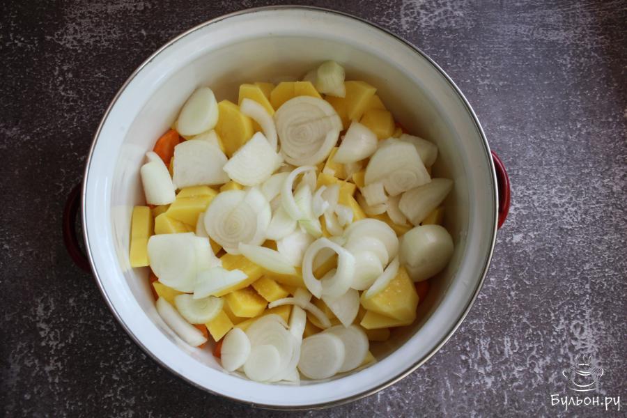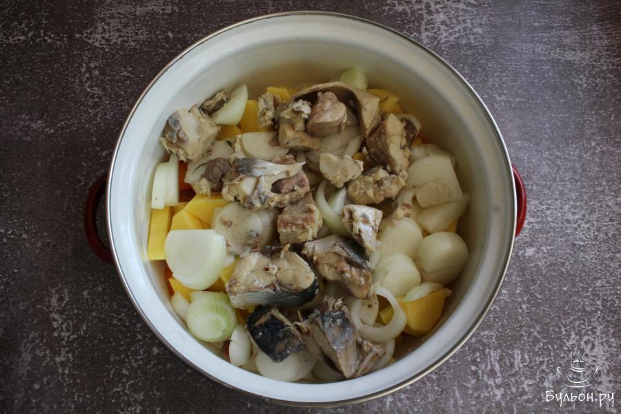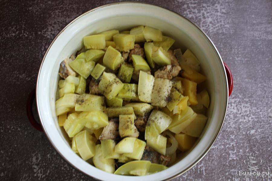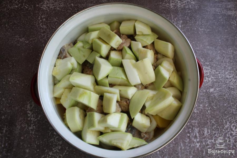 5. Небольшие кабачки нарезать крупно и выложить поверх рыбы. Кастрюлю накрыть крышкой, поставить на огонь и тушить блюдо 35 минут.