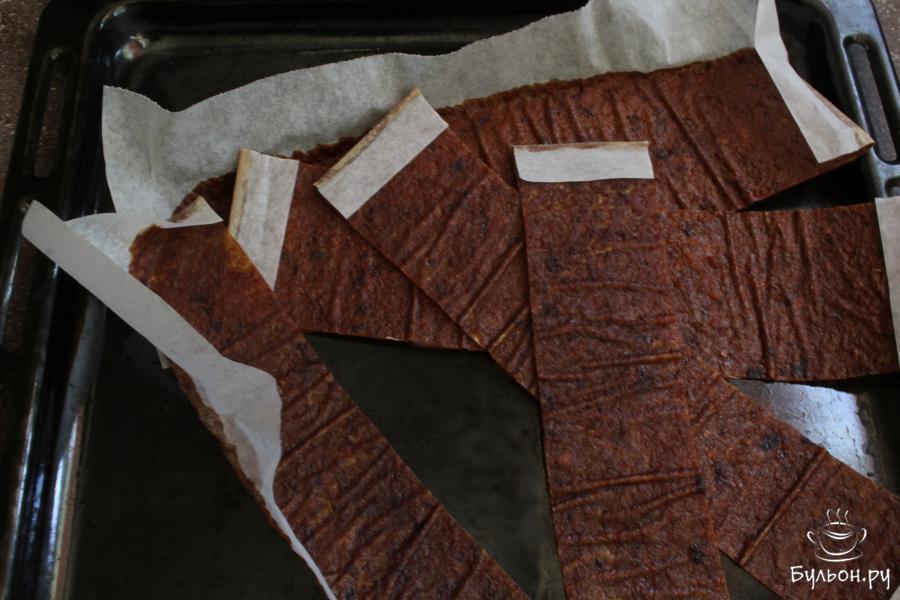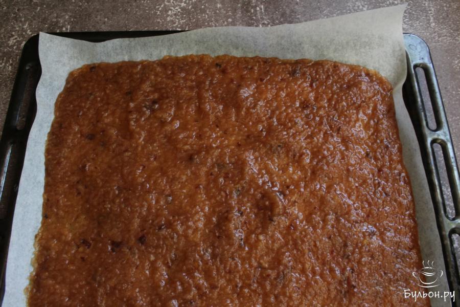 6. Духовку разогреть до 80-100 градусов. Готовить пастилу 3-5 часов. Время приготовления зависит от толщины фруктового слоя. Готовую пастилу немного остудить. Пока она мягкая, нарезать ее вместе с бумагой на полосы нужной ширины.