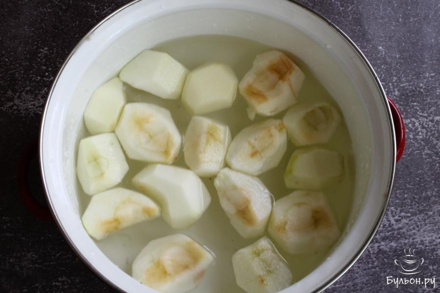 1. Яблоки почистить и нарезать крупно. Добавить воду и сварить яблоки до мягкости, минут 10-15. Воду слить.