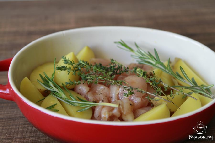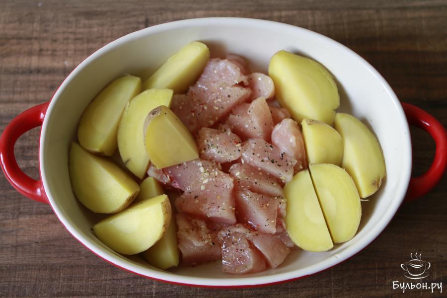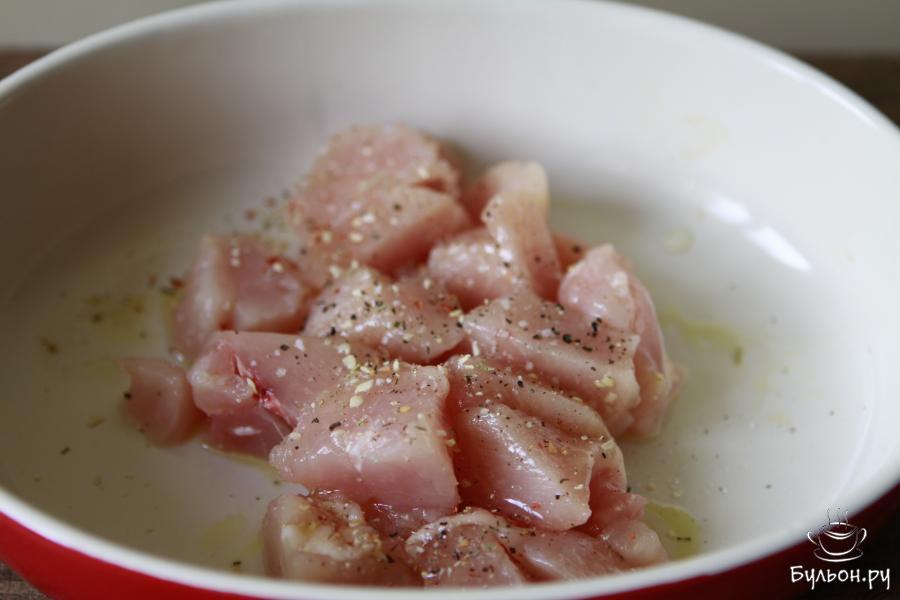 2. Куриное филе промыть, обсушить, нарезать на небольшие кусочки. Переложить в форму для запекания. Сбрызнуть оливковым маслом, приправить травами и специями.
