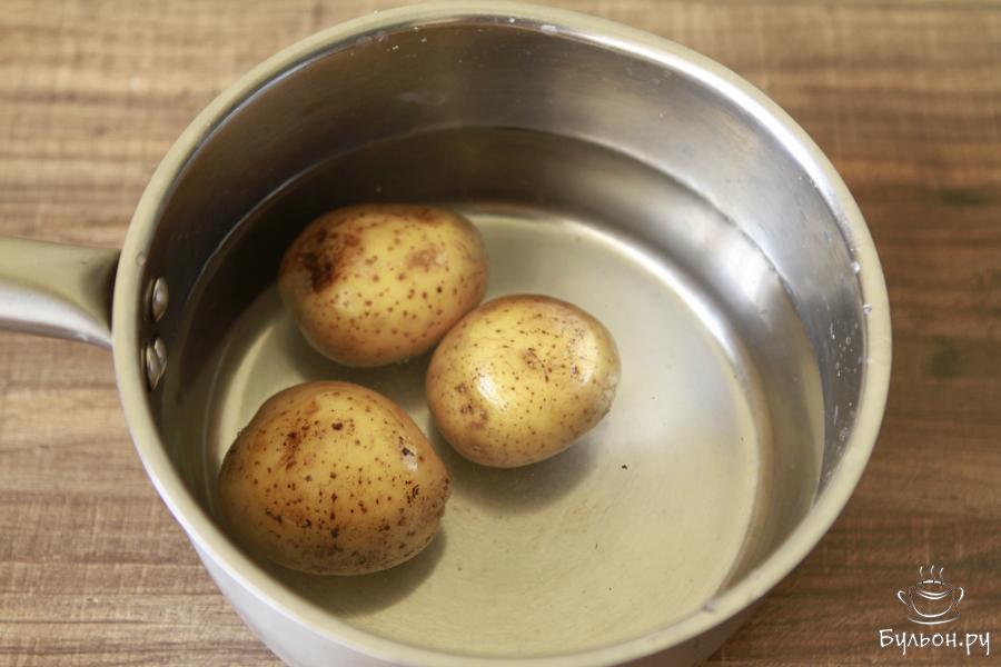 1. Клубни картофеля промыть, переложить в сотейник и отправить на плиту. Отварить до полуготовности.