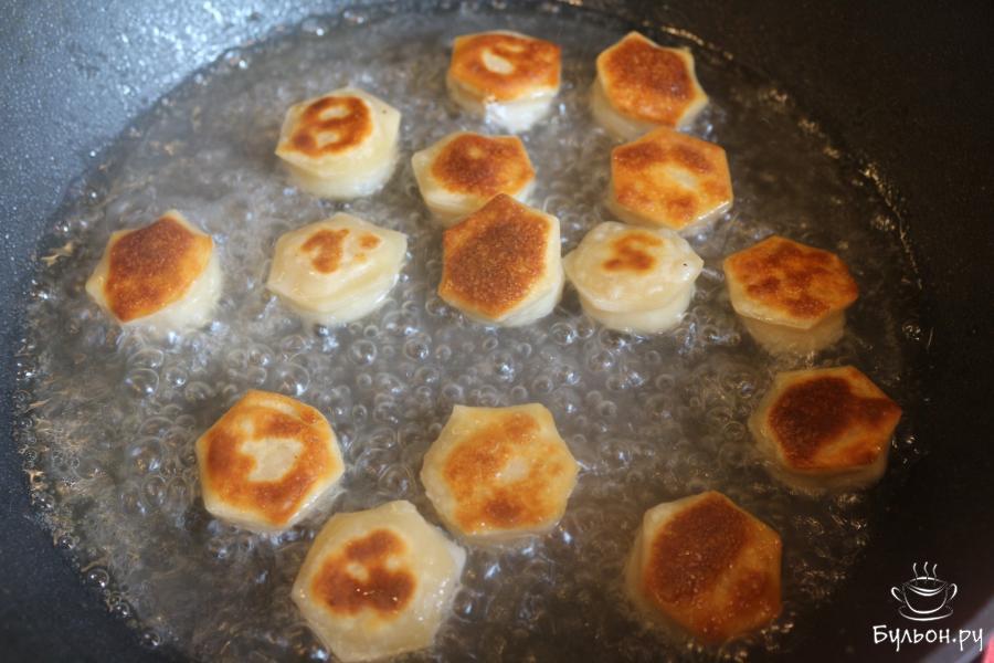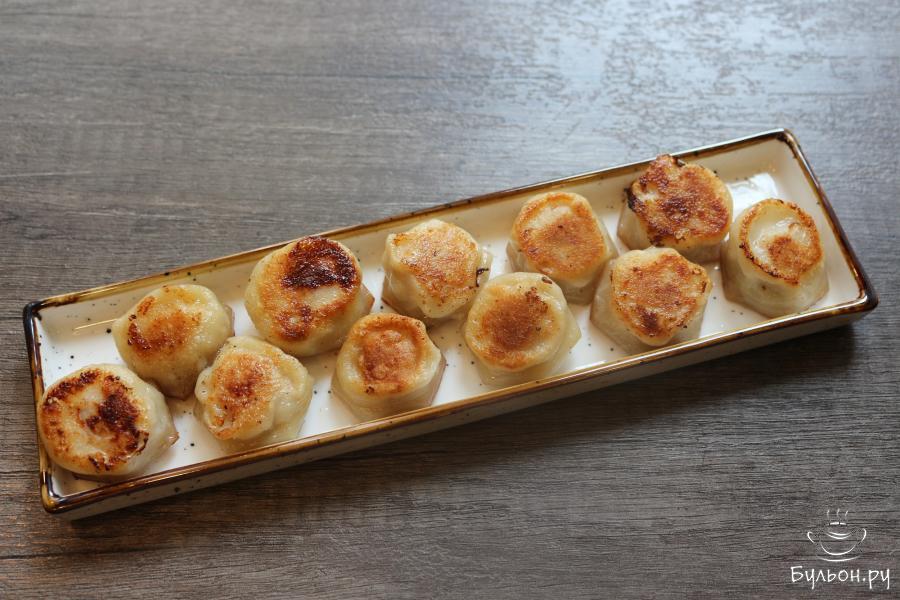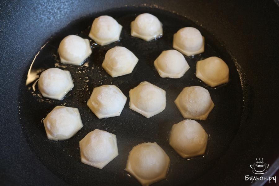6. Затем снимите крышку, готовьте до полного испарения воды, посолите, добавьте еще немного масла и слегка обжарьте пельмени, чтобы и со второй стороны появилась золотистая корочка. Готовые пельмени выложите на блюдо и подавайте с соусами.