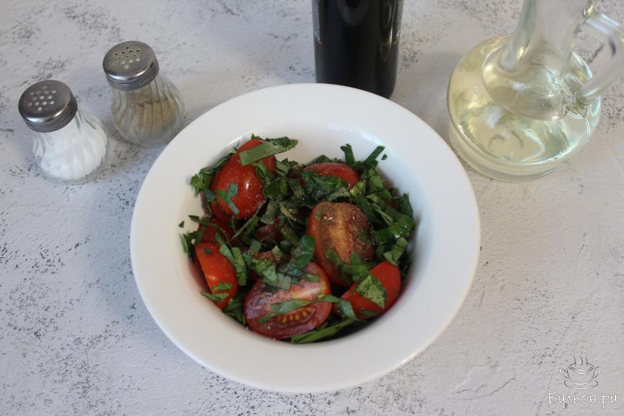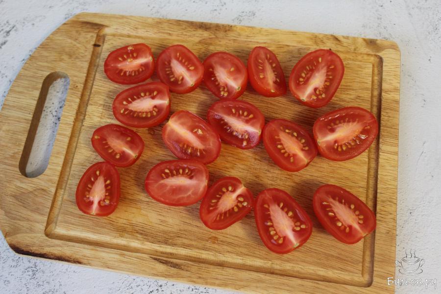 1. Помидоры нарежьте ломтиками среднего размера. Если вы готовите из помидор черри, просто разрежьте их пополам.