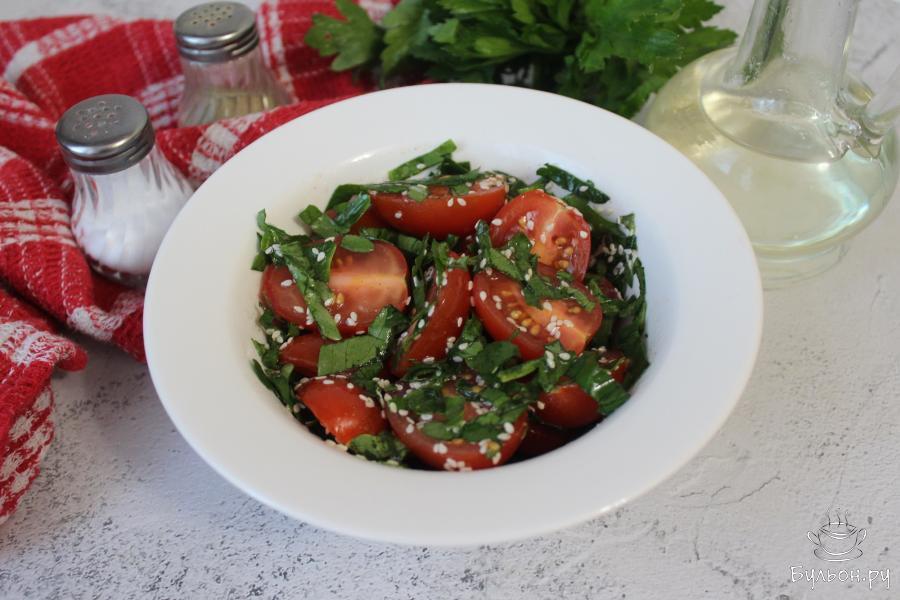 В сезон летних овощей хочется, как можно чаще, готовить и кушать свежие салаты. Так мне очень нравится салат из помидор с кунжутом. Выглядит салат очень аппетитно. Яркие красные помидоры очень хорошо контрастируют с зеленью соответствующего цвета, кунжут придает салату ореховые нотки, да и заправка непростая. В общем, это очень простой в приготовлении и очень вкусный летний салатик, который готовится за считанные минуты.