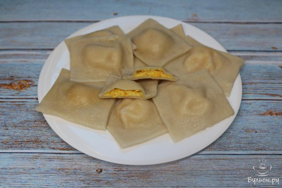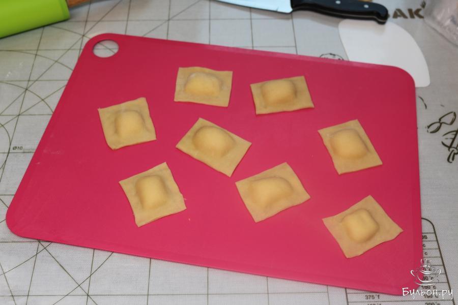 9. Отварите в подсоленной воде равиоли 5-7 минут. Подавайте их сразу горячими, полив растопленным сливочным маслом.