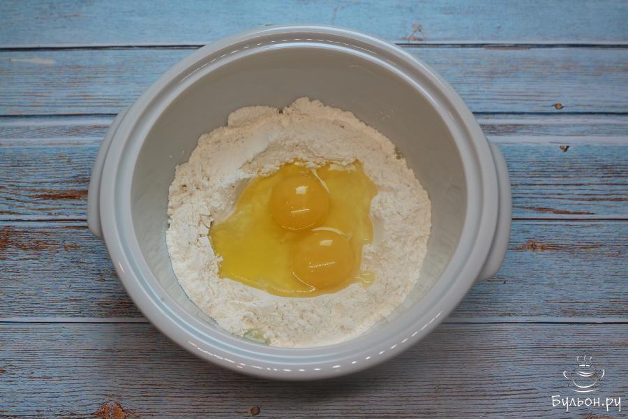 2. Приготовьте тесто. Просейте большую часть муки, в центре сделав углубление. Вбейте в углубления яйца и смешайте все вместе.