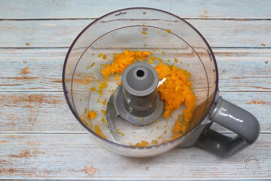 4. Запеченную тыкву измельчите при помощи блендера. Переложите ее в миску, добавив рикотту и мускатный орех.