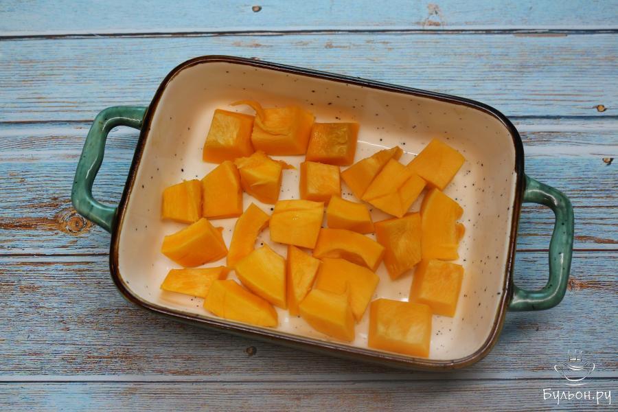 1. Тыкву вымойте, очистите и нарежьте на куски. Положите их в форму для запекания. Выпекайте в духовке при 180 градусах 40 минут так, чтобы она стала мягкой.