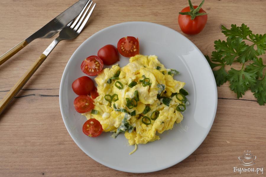 Скрэмбл или яичница-болтунья очень популярное блюдо, которое можно быстро и легко приготовить на завтрак. Предлагаю приготовить скрэмбл со сметаной и зеленым луком на сливочном масле. Блюдо получается очень сытное, со сливочным вкусом, а зеленый лук придает яркую краску и легкую пикантность. Не пережаривайте яйца, чтоб скрэмбл остался нежным и мягким. При подаче добавьте к скрэмблу свежие овощи и зелень.