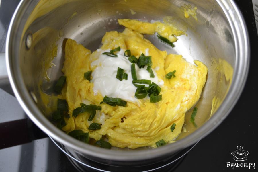 6. Посолите. Снимите сотейник с огня, пока яичная масса остается немного влажной, блестящей, не пережаренной. Добавьте сметану и нарезанный зеленый лук. Перемешайте. Скрэмбл готов к подаче.