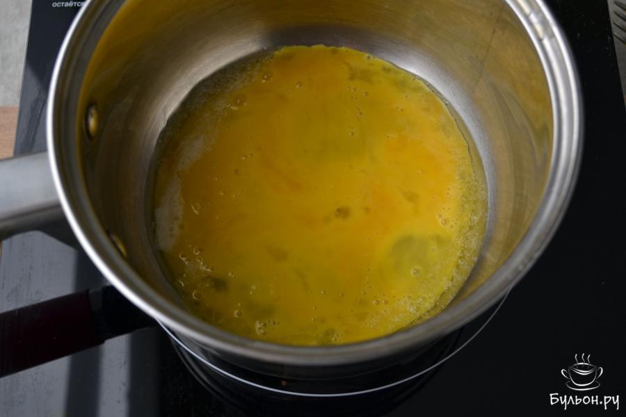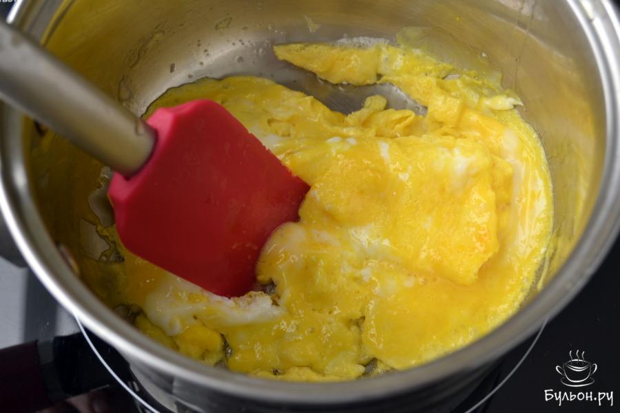 5. Сделайте огонь ниже среднего, дождитесь, когда яйца начнут "схватываться" и аккуратно перемешайте массу.