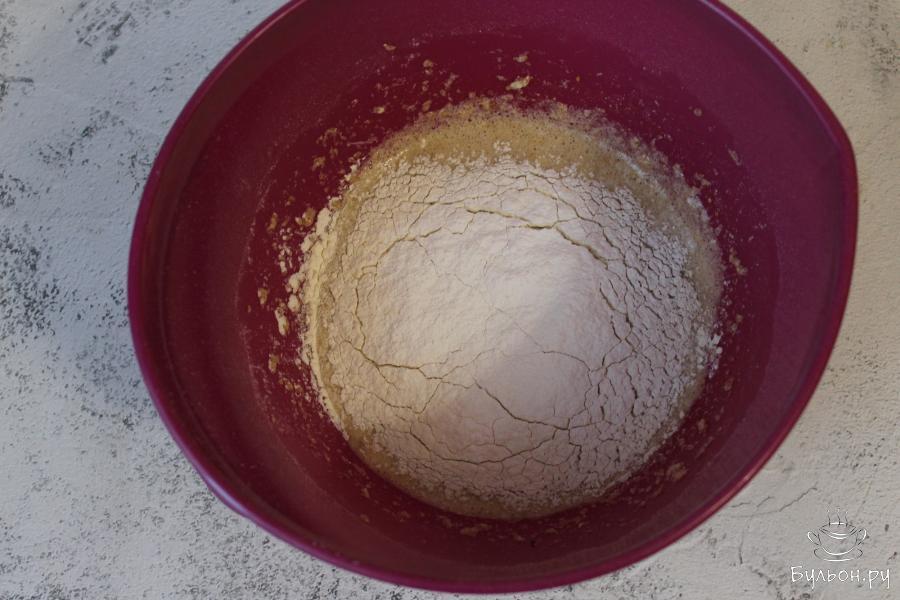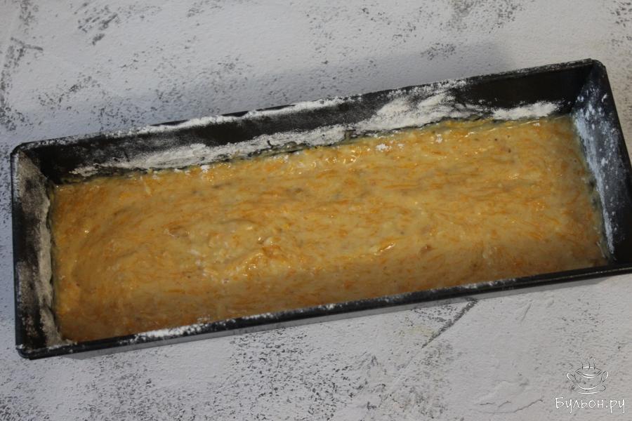 5. Смажьте форму очень тонким слоем сливочного масла, присыпьте мукой и потрясите, излишки муки вытряхните. Залейте тесто в подготовленную форму.