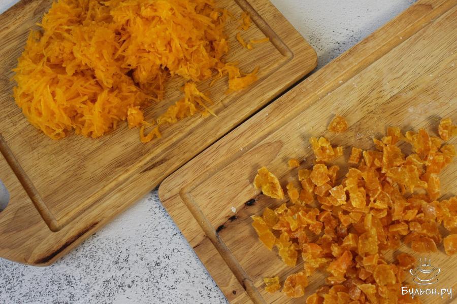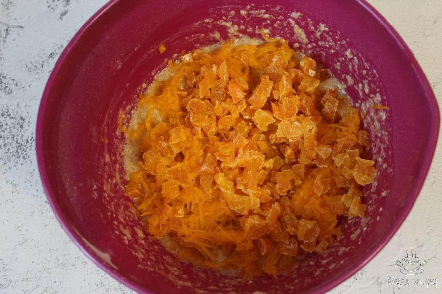 4. Теперь добавьте натертую тыкву и кусочки кумквата. Замешайте тесто. Оно должно получиться чуть гуще, чем тесто на оладьи.