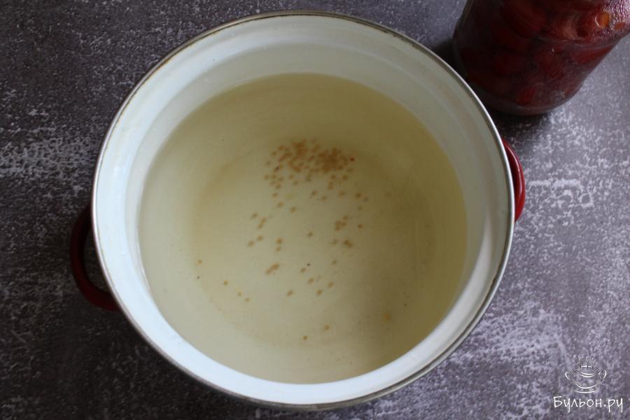 6. Разлить по банкам кипящий рассол, закрыть банки закручивающимися крышками. Перевернуть банки. Укутать теплым до остывания.