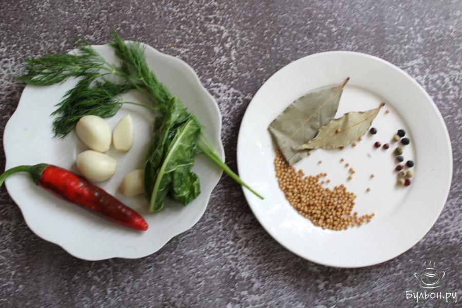 1. Подготовить все необходимое для заготовки: горчицу в зернах, перцы горошки, лавровый лист, чеснок почистить, перец чили и зелень промыть.
