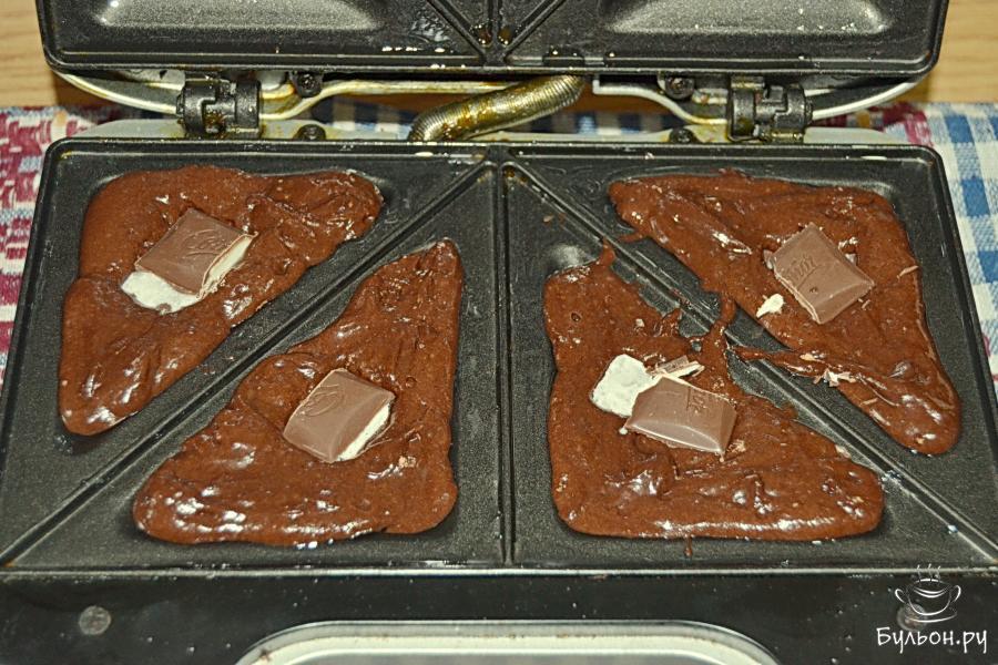 8. Положить в тесто по кусочку или по половине кусочка шоколадки. Шоколад можно использовать любой - белый, черный, с начинкой.