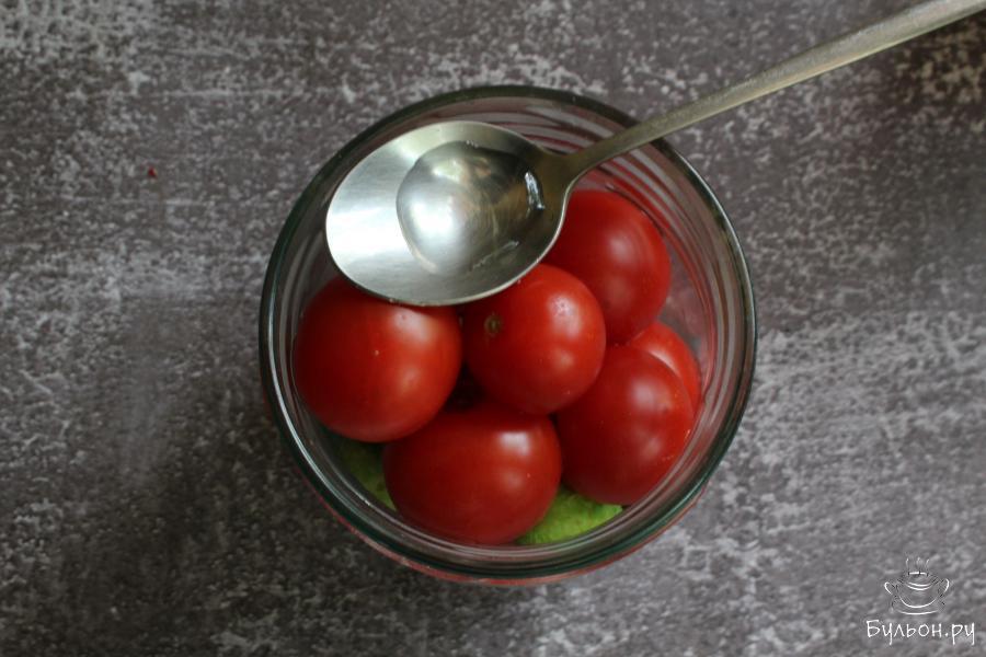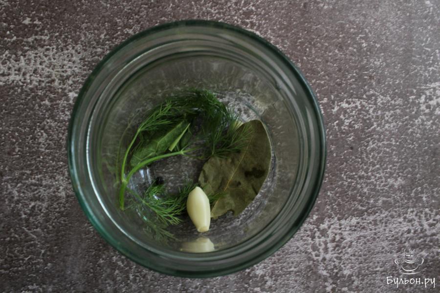 1. В поллитровую банку выложить: пару очищенных зубчиков чеснока, перец горошком, кружочек перца чили, лавровый лист, веточку укропа, кусочек хренового листа.