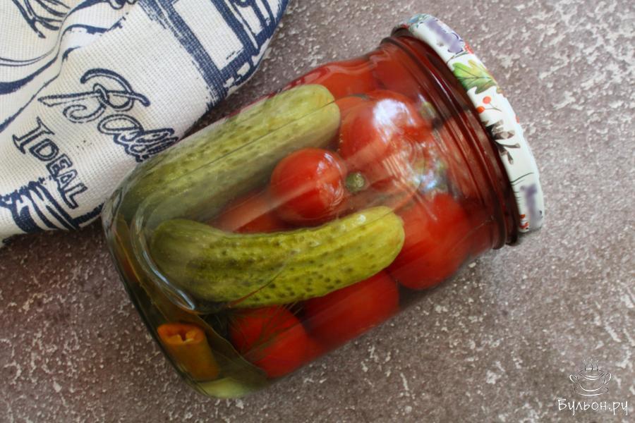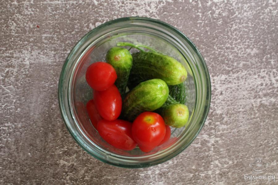 Ассорти из помидоров и огурцов на зиму нужно, для разнообразия, обязательно приготовить хотя бы пару баночек. Если вы готовите отдельно помидоры и отдельно огурцы, то знайте, что готовый маринад у них отличается по вкусу. Значит надо смешать овощи, чтобы они дополнили своим вкусом друг друга. Эти овощи получаются вкусные, огурчики будут хрустящие, а помидорки сочные. Такие баночки с яркими овощами поднимут вам зимой настроение. Количество продуктов дано на одну поллитровую баночку.