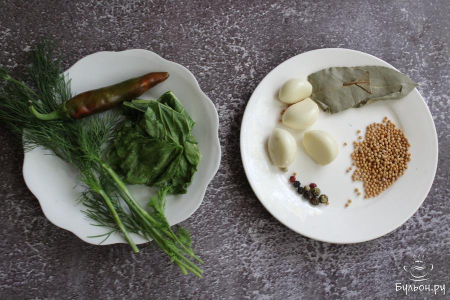 2. Приготовить ингредиенты для консервации: перец горошком, лавровый лист, зерна горчицы. Чеснок почистить. Лист хрена, укроп, чеснок и перец чили промыть.
