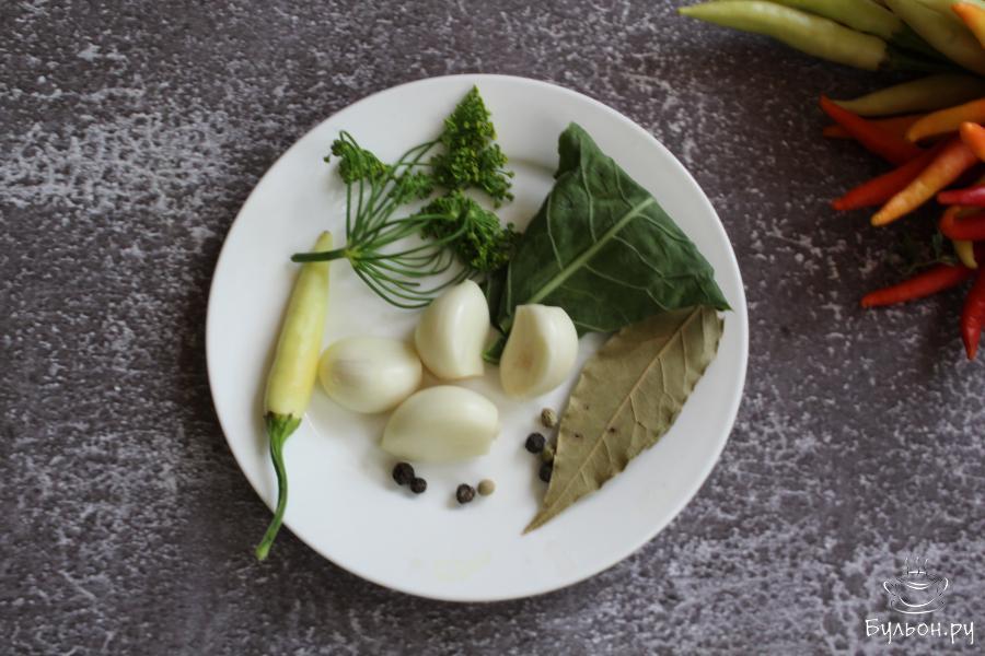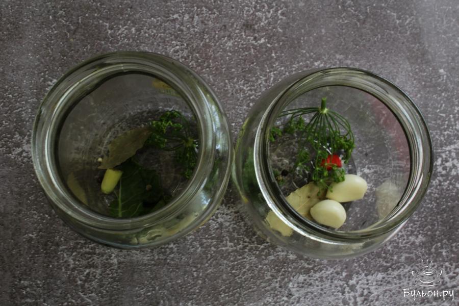 3. Распределить по двум литровым баночкам: по кусочку перца чили, перец горошек, чеснок, по кусочку хренового листа, лаврушку, зонтики укропа.