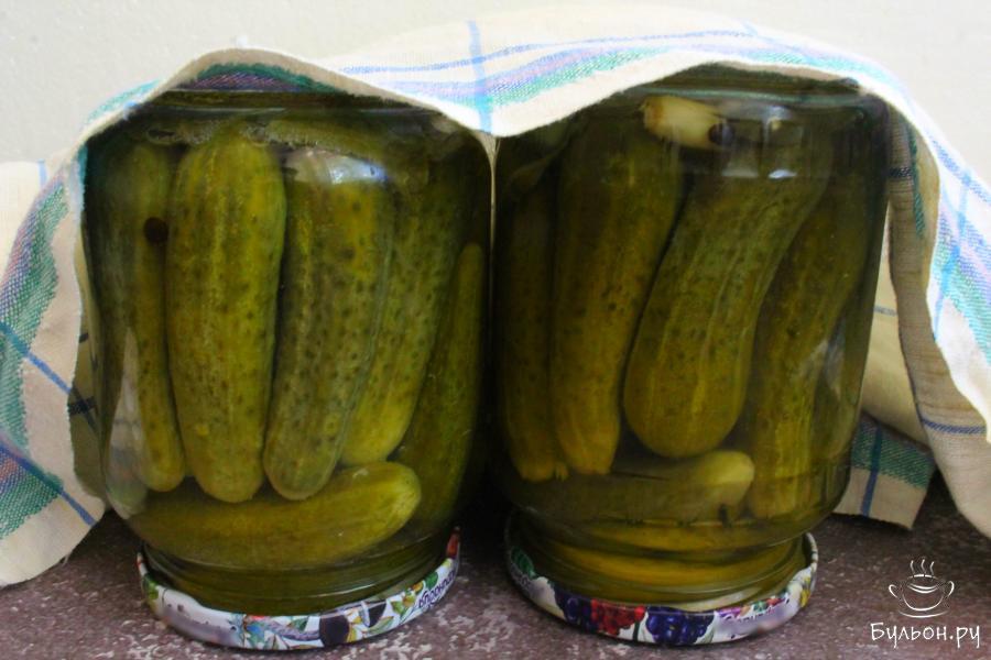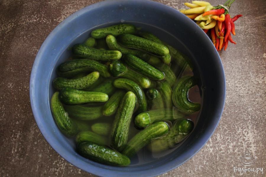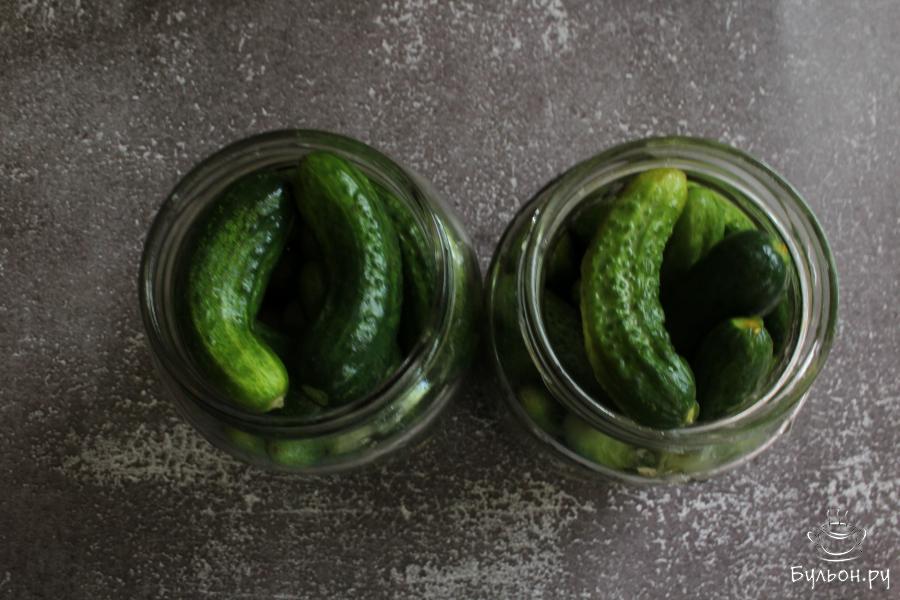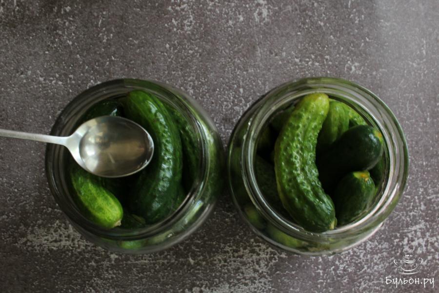 4. Огурцы промыть еще раз и разложить по баночкам. Залить огурцы кипятком. Через 15 минут воду слить.