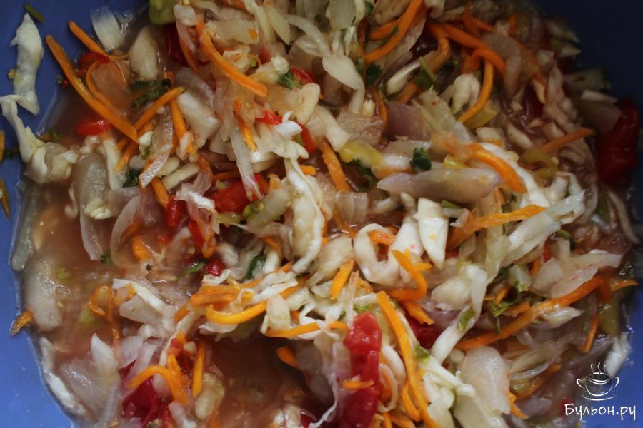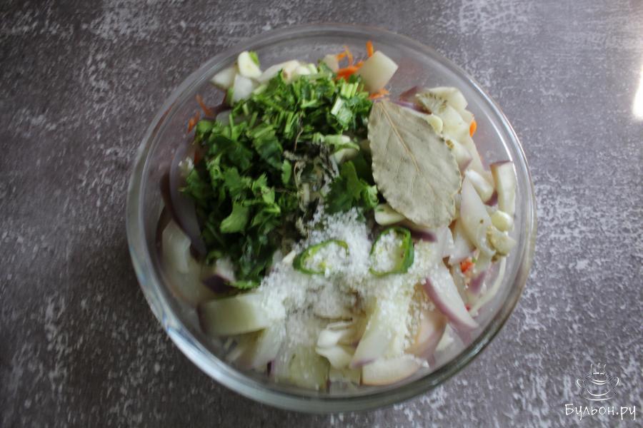 6. Добавить в салат лавровый лист, щепотку сухой мяты, соль. Перемешать и оставить салат на 12 часов при комнатной температуре.