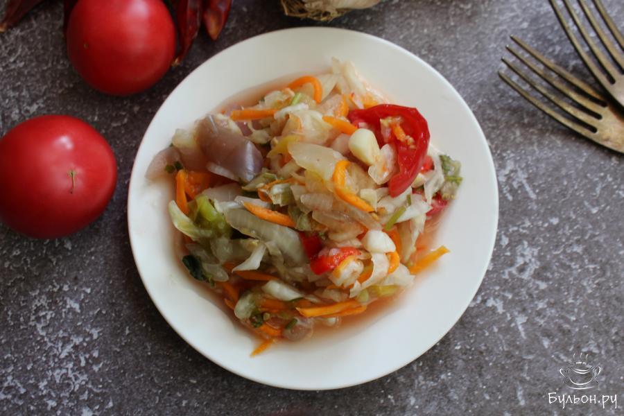 Азербайджанский овощной салат "Хефтябечяр" - это прекрасный салат, который хорошо готовить летом и осенью, потому что в этот салат идет много разнообразных овощей. Салат легкий, тут овощи заквашиваются, он полезнее, чем салаты с уксусом или майонезом. Салат подходит для вегетарианцев и постящихся, для худеющих. Готовится салат не быстро, его готовность вы узнаете по аромату заквашенных овощей. Этот салат получается очень вкусный, сочный, душистый, остренький.