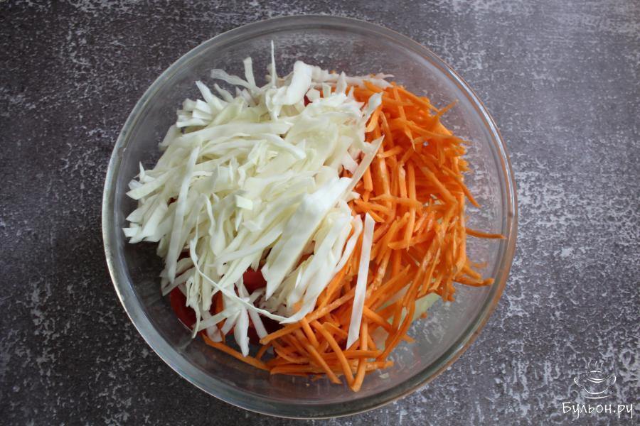 4. Капусту нашинковать не очень тонкими полосками. Морковь перетереть соломкой на терке для корейских салатов.