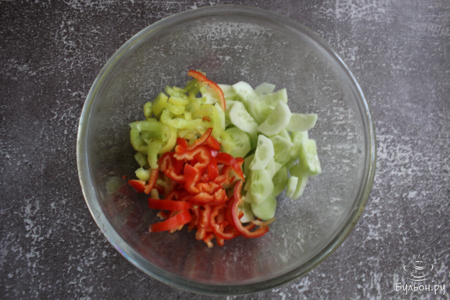 2. Огурцы нарезать тонкими кружочками или полукружочками. Болгарские перцы почистить и нарезать тонкими полосками.