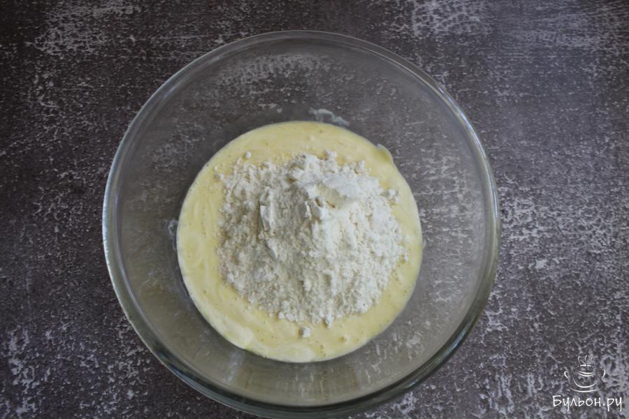 3. Добавить в чашку муку и снова хорошо перемешать. У нас получится не очень жидкое, но и не густое тесто.