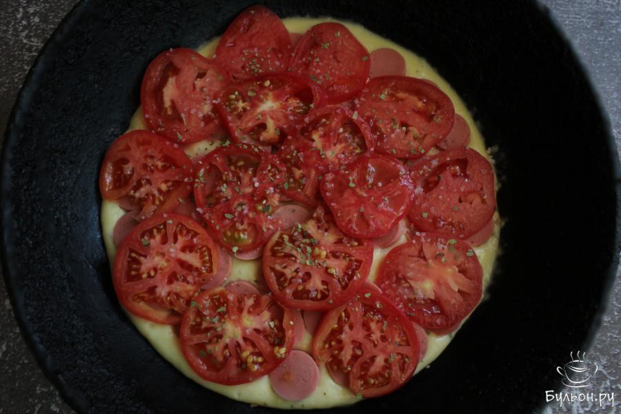 5. Помидоры нарезать тонкими кружочками и разложить на сосиски. Помидоры посолить и посыпать орегано.