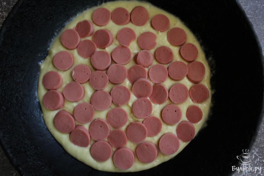 4. Сковороду смазать маслом. Выложить тесто. Сосиски почистить, нарезать кружочками и разложить их по тесту.