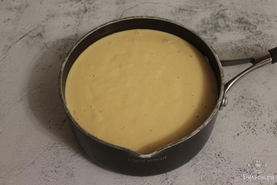 5. Получившуюся массу перелейте в кастрюлю, поперчите и посолите, прогрейте на плите в течение нескольких минут.