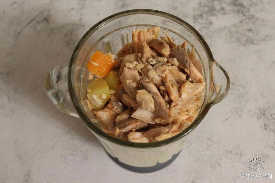 3. Отваренные овощи и филейные кусочки лосося вместе с 1,5 стаканами бульона пробейте в блендере до однородной консистенции. При необходимости добавьте еще немного бульона.